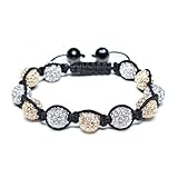 A stunning shamballa bracelet for your collection. Made with silver and gold Swarovski crystals, this brilliant crystal shamballa bracelet will look perfect paired with any outfit. This silver gold Swarovski crystal shamballa bracelet secures with a black macrame adjustable slide closure that allows this bracelet to be an easy to wear piece of jewelry. Enhanced by two shining black shamballa bead on the pull closure this alluring silver and gold shamballa bracelet is simply beautiful. This cryst