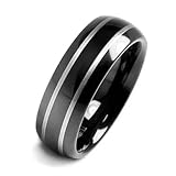 This mens tungsten ring has a charming sleek look. Our black tungsten wedding bands are the less conventional choice for a wedding band but this will accentuate your charismatic personality even more. This curved black tungsten wedding ring has a high polish shine and features two narrow lines of silver on the band. This black tungsten wedding ring is made from tungsten carbide, ensuring that it is tarnish resistant and extremely strong. This mens tungsten wedding band is an ideal gift or a grea